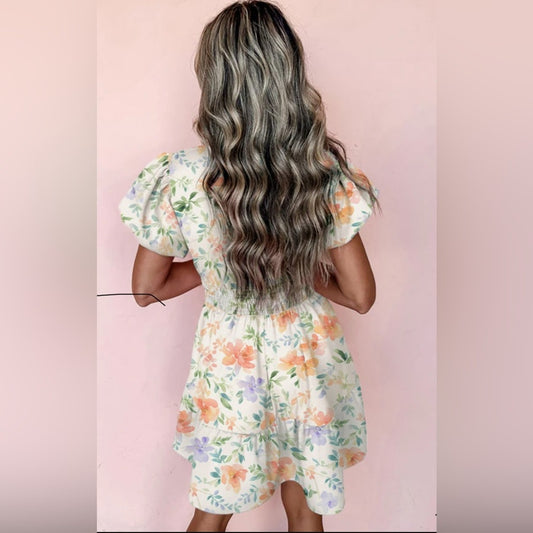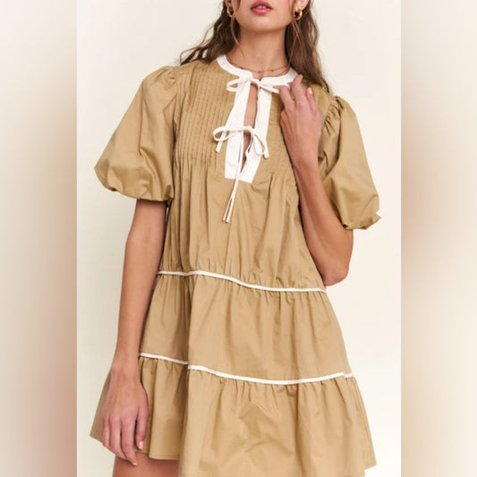 Rosi- beige print shirred high waist puff sleeve mini dress