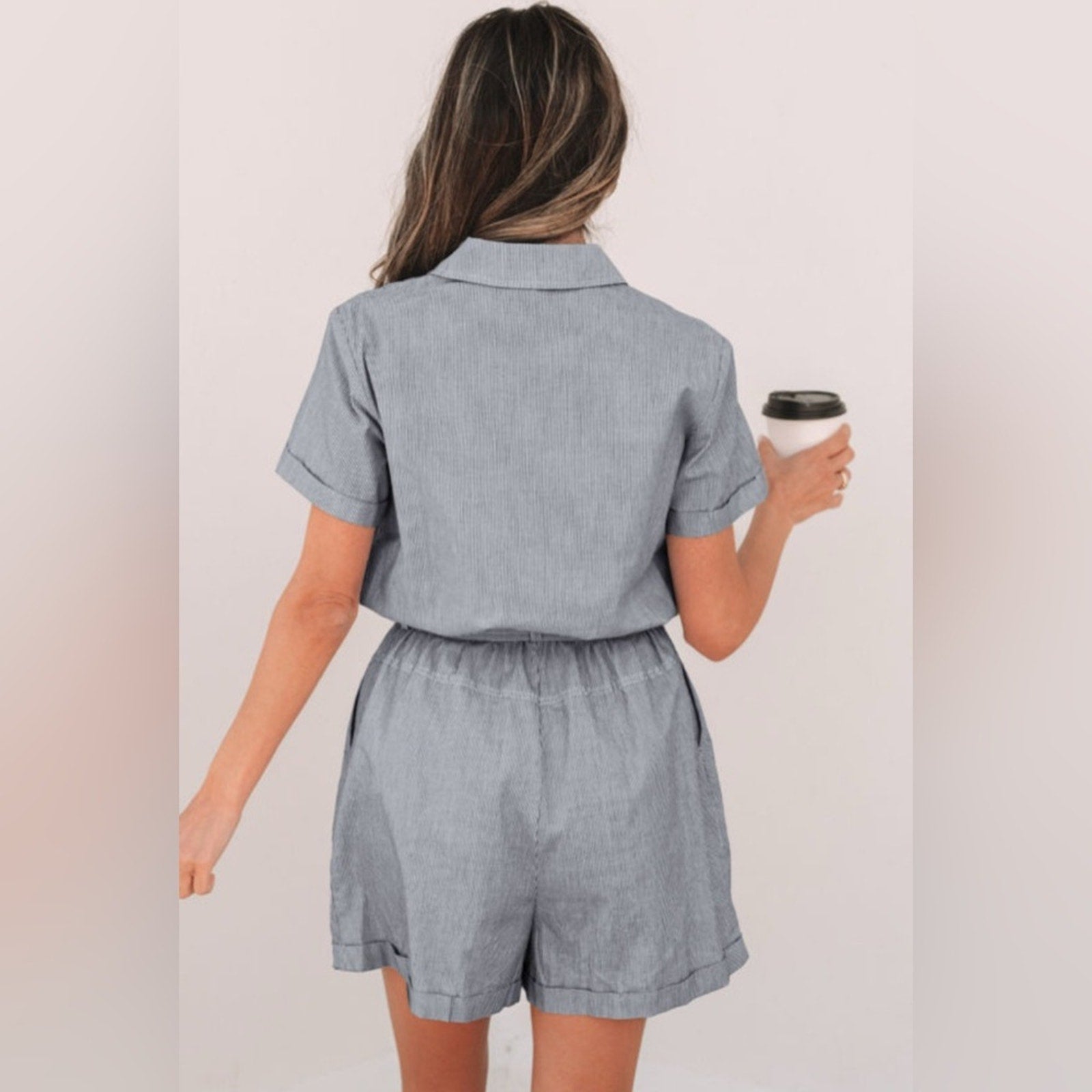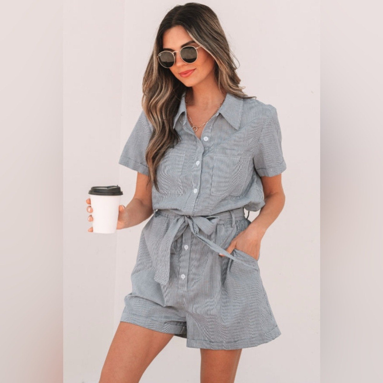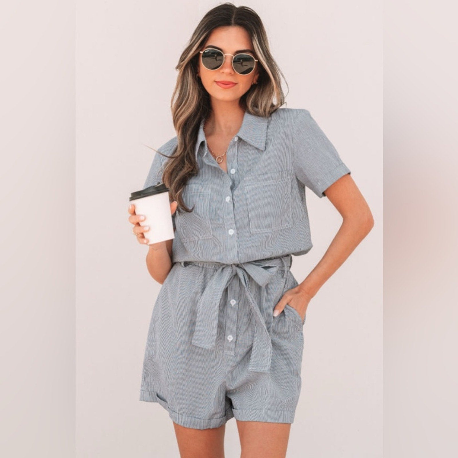 Stylish blue striped romper with short sleeves and a tie waist. Features a button-up front and chest pockets.